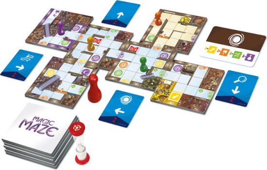 vallen. Enkel op die manier kunnen ze over alle nodige uitrustingen voor hun volgende avontuur beschikken. Magic Maze is een real-time coöperatief spel, meestal in stilte gespeeld, die jouw gewoontes binnenste buiten zal draaien. Wat maakt die spel uniek : de speler die de karakters naar het noorden kan verplaatsen (bijvoorbeeld), is de enige speler die dit mag doen. Daardoor is het aan hem om te zien medespelers enkel naar hem kunnen staren of de “Doe iets!” pion voor hem neerleggen in de hoop dat hij zal reageren! Je moet echt samenwerken om de helden te helpen de supermarkt te ontdekken, de uitrusting te stelen en daarna weg te lopen.