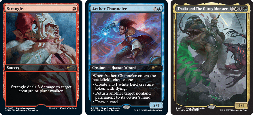 Aan het einde van het toernooi krijgt iedere speler sowieso een Strangle Promo. Hiernaast gaat er ook nog 1 booster per persoon in de prijzenpot. De top 8 krijgt een Aether Channeler Promo en de winnaar van het toernooi krijgt een Thalia and The Gitrog Monster promo!