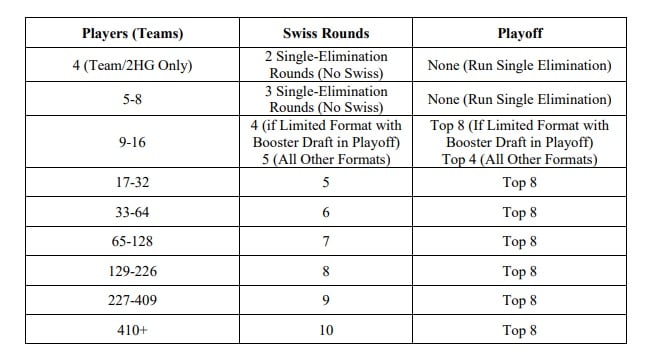 Afhankelijk van het aantal spelers worden er 3-5 rondes gespeeld met een top 4-top8 cut. Voordat de eerste ronde begint wordt dit bekend gemaakt.