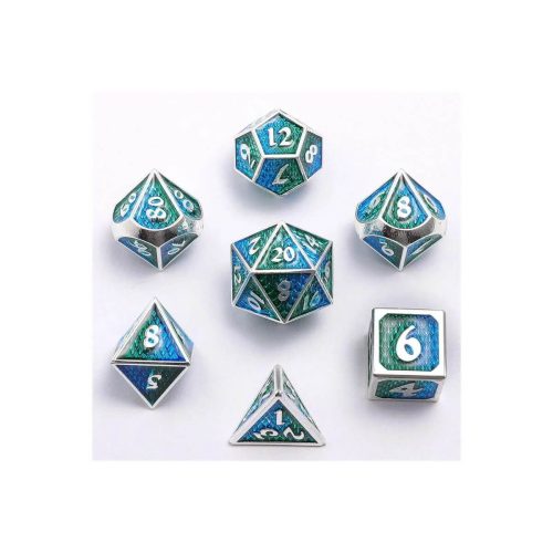 Silver w/Green & Aqua Behemoth – Mini Metal Dice – 7 stuks