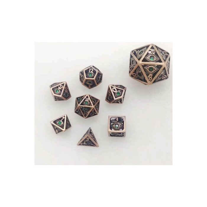 Ancient Copper Dragon’s Eye w/Green Gems – Hollow Metal Mini Dice set – 7 stuks