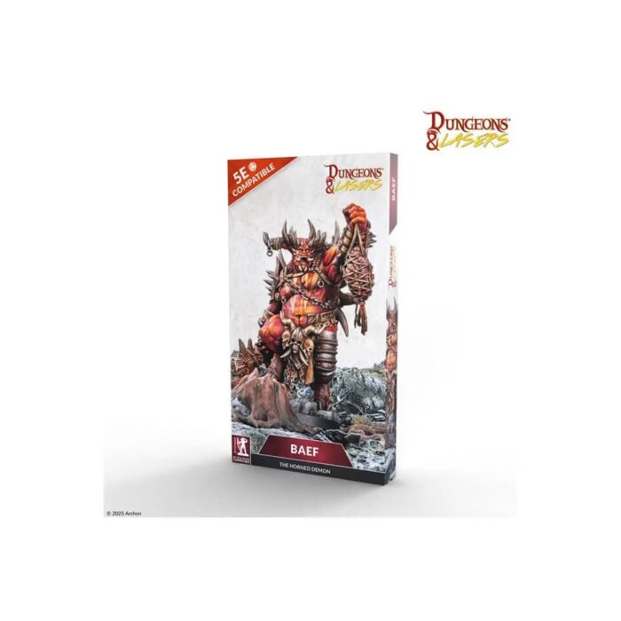 Baef the Horned Demon – Dungeons & Lasers is een uitstekend product voor roleplaying games, zoals Dungeons & Dragons. Immers, dit imposante model voegt direct een dreigende en krachtige figuur toe aan je speeltafel. Deze angstaanjagende miniatuur is ontworpen door Archon Studio en staat garant voor ongelooflijk detailwerk. Daarom is het een geweldige aanrader voor iedereen die van verzamelen, schilderen en het visualiseren van krachtige wezens houdt.