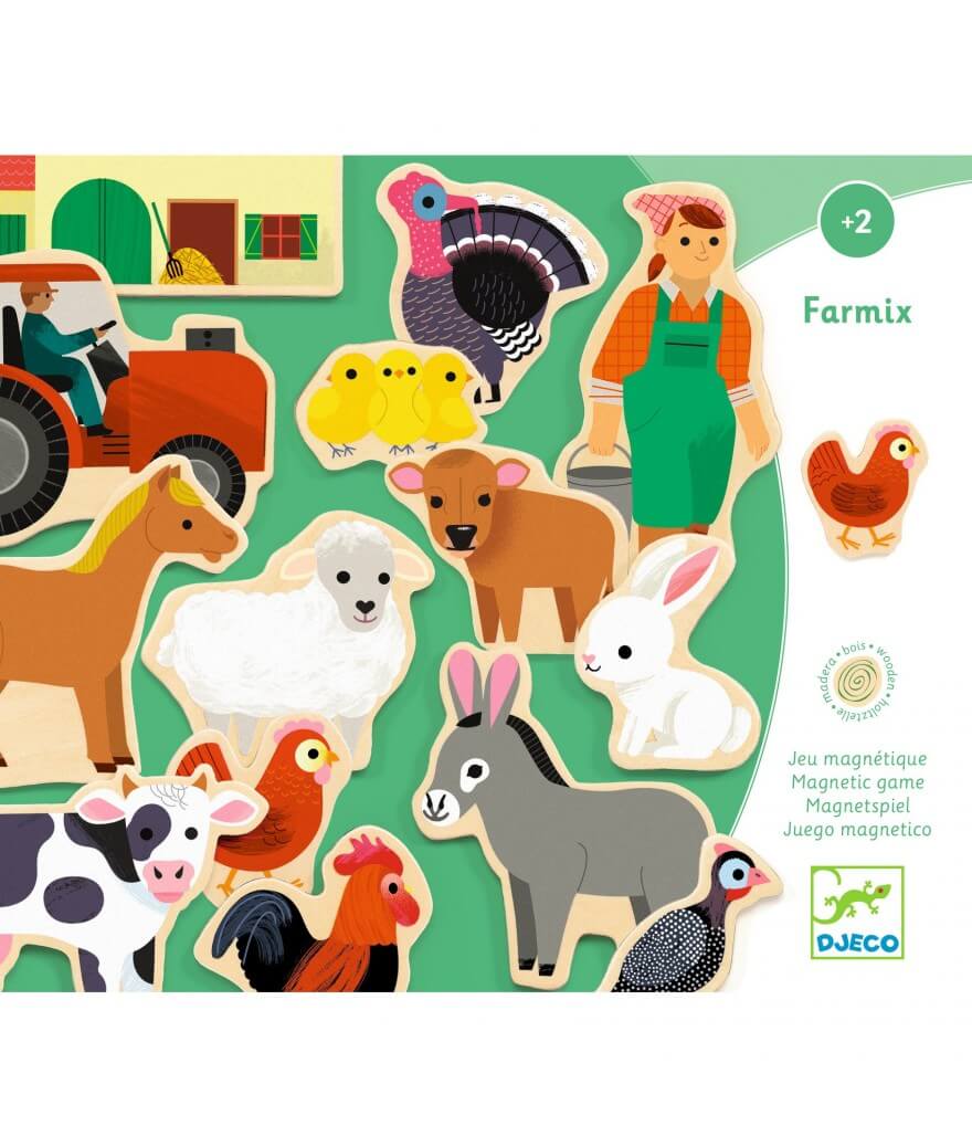 Een doos met 24 magnetische houten stukken met het thema de boerderij.