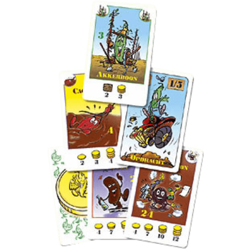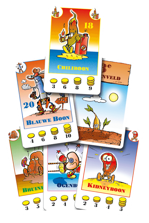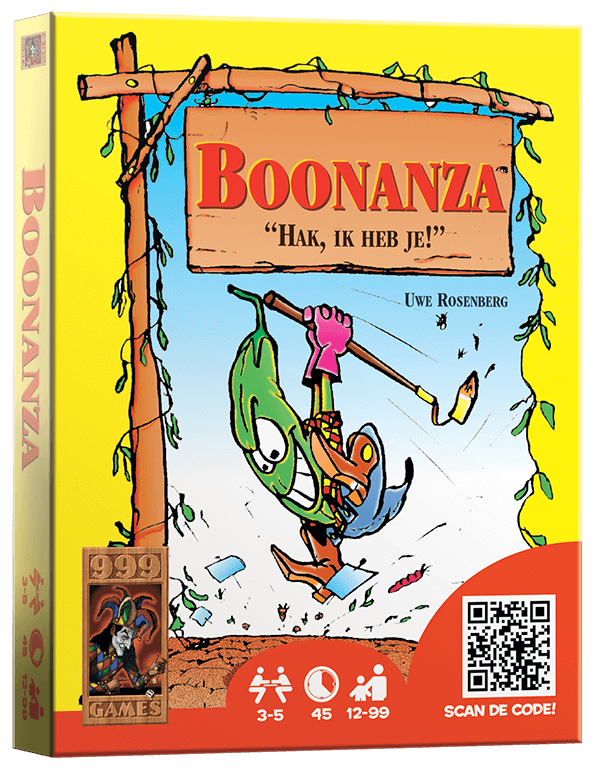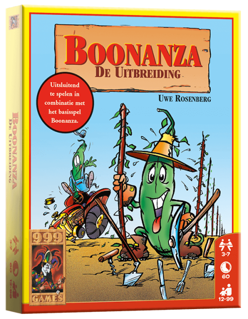 In dit communicatieve kaartspel handelen de spelers met hun bonen en verbouwen deze op hun akkers. Wie troggelt de andere spelers de beste bonen af en verdient het meeste geld? Iedere speler krijgt 5 bonenkaarten en moet deze op volgorde in zijn hand houden. Verder heeft hij twee bonenvelden, waarop hij bonen verbouwt. Als je aan de beurt bent, moet je één of twee kaarten uit je hand verbouwen. Daarna mag je met de andere spelers handelen. Als je genoeg bonen op een veld verzamelt, kun je deze voor goed geld verkopen. Maar omdat je soms een soort moet verbouwen die niet op jouw veld past, kan het gebeuren dat je de boel voor weinig geld weg moet doen… Boonanza is een fascinerend handelsspel van de auteur van Agricola en Le Havre en is een echte aanrader voor liefhebbers van bijvoorbeeld De Kolonisten van Catan. Pluspunten: