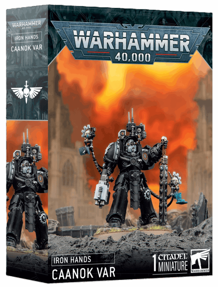 This multipart plastic kit builds Caanok Var, a cold and calculating leader for your Iron Hands Space Marines armies in games of Warhammer 40,000. Clad in custom Terminator armour, he is a tough target to kill, and his fury in melee as he swings his devastating power maul, or aims his storm bolter, will make your enemies regret facing him. Gamers will love the destruction he causes on the tabletop. Painters will appreciate the details, including a pair of servo-skulls providing tactical information and various augmented body parts, such as a bionic eye, heart, and the obligatory iron hand.