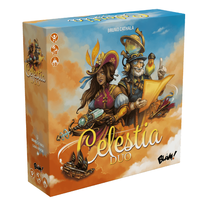 Celestia Duo is een coöperatief spel voor 2 spelers met beperkte communicatie. Deel tijdens je reis de kaarten om hinderlagen te verijdelen. Anticipeer op de hand van je partner, want als een van jullie tijdens zijn beurt niet tegen een dobbelsteen kan vechten, loopt het vliegtuig schade op. Stop op het juiste moment in de vliegende steden om voorraden in te slaan en passages met nuttige vaardigheden te rekruteren…