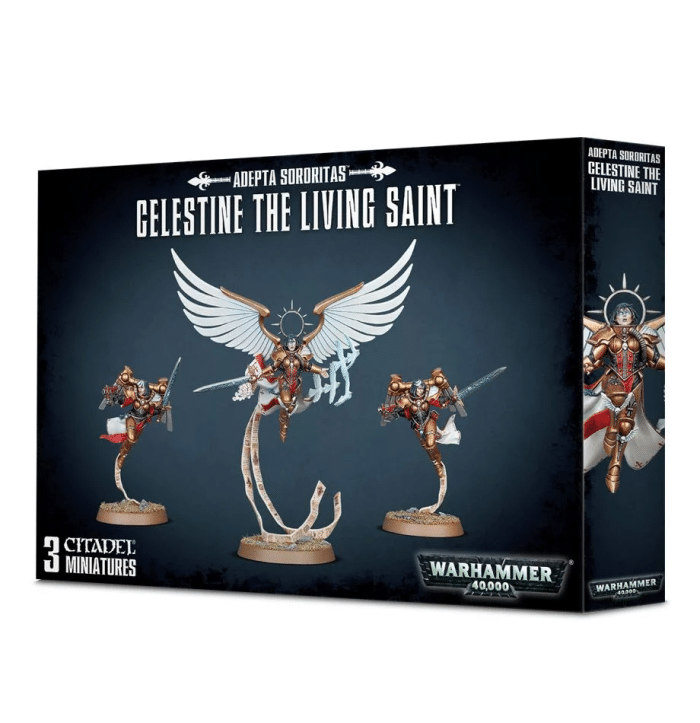 This multi-part plastic kit contains the components necessary to assemble Celestine, the Living Saint, and her 2 accompanying Geminae Superia. She wears the Armour of St. Katherine, a set of glorious golden plate replete with holy icons and sculpted symbols. The model is held aloft from the base by a scripture that attaches to her billowing cloak – even this detail is dwarfed by the enormous wings that span out from her backpack, with a spiked iron halo above her enraptured face. The sparking Ardent Blade in her right hand blossoms with roses, even as a brace of doves is released on her left. She is accompanied by the Geminae Superia, wearing similar armour (with smaller wingspans) and aggressively wielding bolt pistols and power swords.
