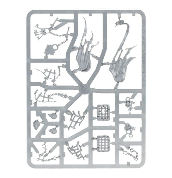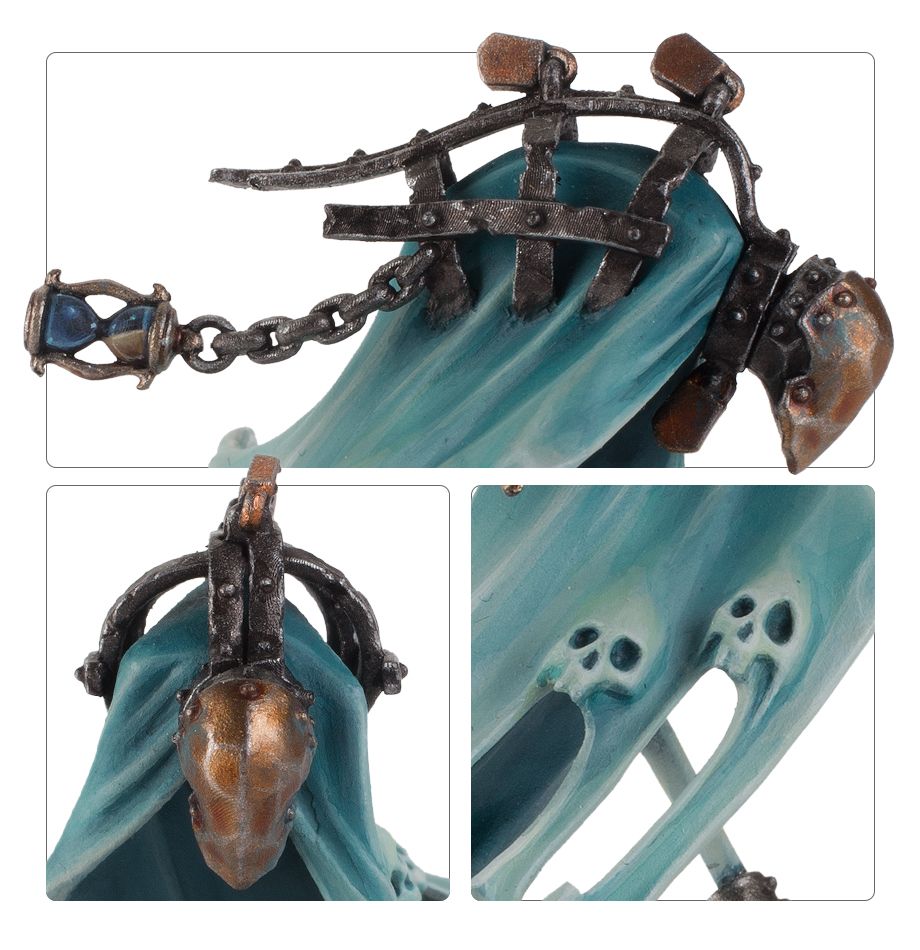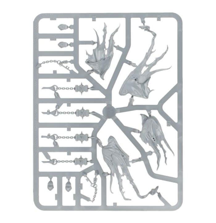The accompanying Chainghasts each carry a pair of Ghastflails, with robes covering their forms. There are 4 different masks available for the Chainghasts. Each entirely closed and sinister, and there are included 8 pieces of scenery detritus. Sections of gibbet, broken locks and metal – with which to decorate the bases.