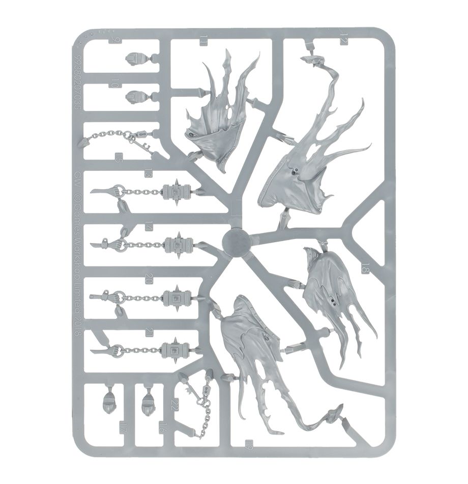 This multi-part plastic kit contains the components necessary to assemble Crawlocke the Jailor. A Spirit Torment. And 2 accompanying Chainghasts. Crawlocke himself is little more than an ethereal wisp. With emaciated arms reaching from under a shroud. Featuring the tormented faces of the damned. To grasp his large, ensorcelled padlock and set of heavy keys. Which are used to belabour the living. There are 3 choices of grim face mask for the Spirit Torment. And his ethereal form is trapped within a confining gibbet cage, from which a grave-sand filled hourglass dangles.