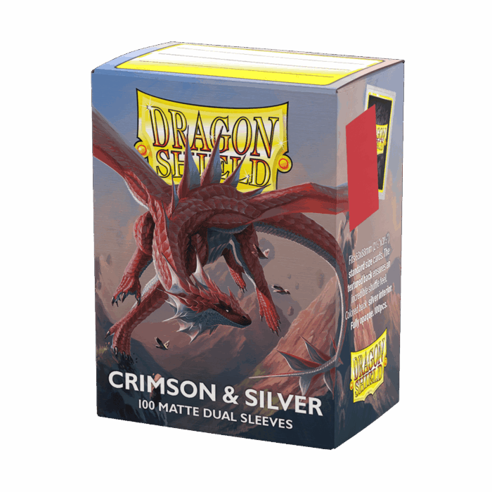 Bescherm je kaarten met de Crimson & Silver – Matte Dual Sleeves – 100 stuks, voorzien van een rode achterkant en zilveren binnenzijde voor optimale bescherming.