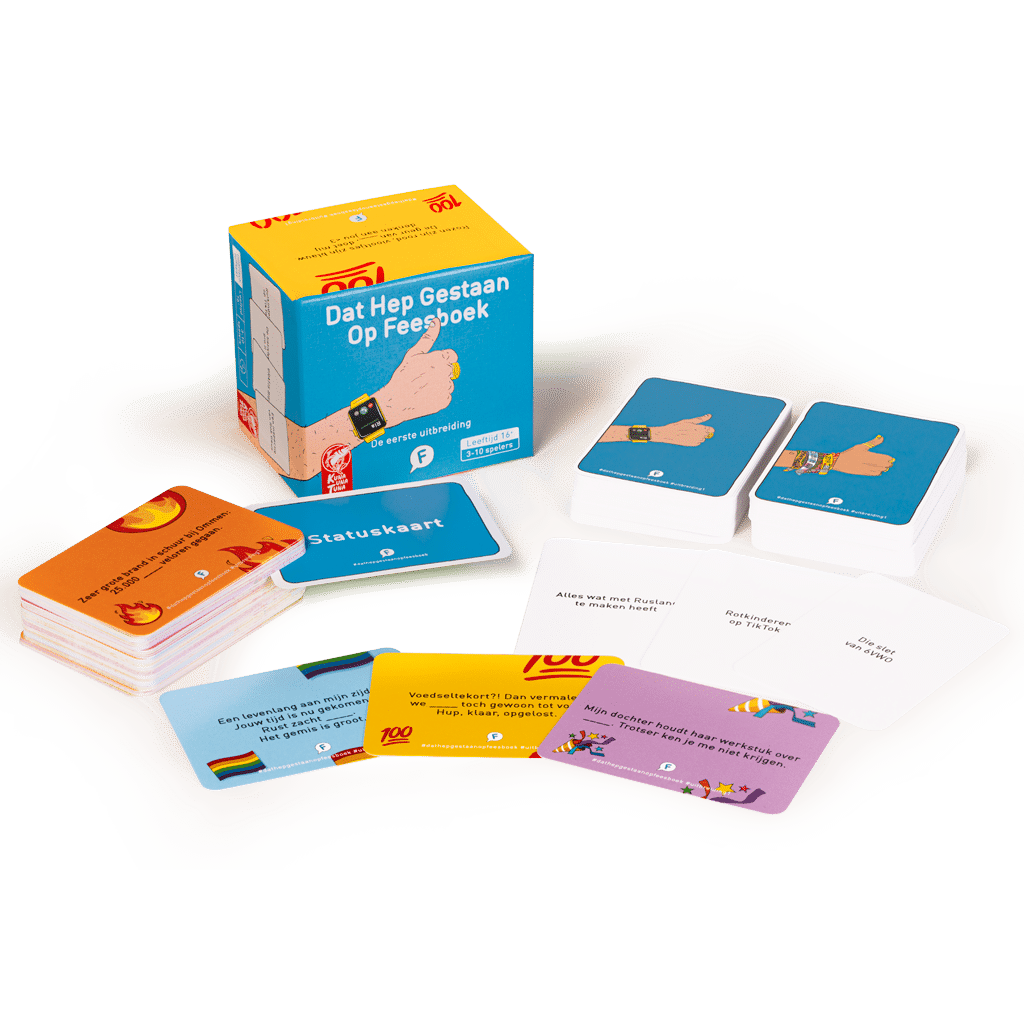 Dat Hep Gestaan Op Feesboek – De Eerste Uitbreiding is een officiële uitbreiding voor Dat Hep Gestaan Op Feesboek. In deze uitbreiding vind je 75 nieuwe statuskaarten en 125 nieuwe aanvulkaarten om je basisspel uit te breiden. Hierdoor kan je in totaal ±75.000(!!) combinaties maken. Dat zijn er 30.000 meer dan je met alleen het basisspel kan. WAJO!