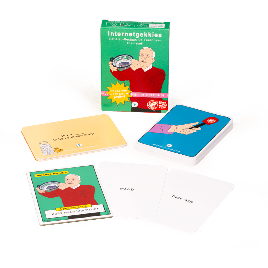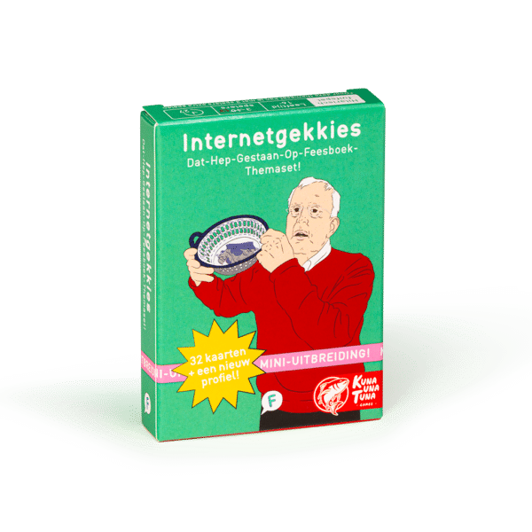 Internetgekkies Themaset is een officiële uitbreiding voor Dat Hep Gestaan Op Feesboek. In deze uitbreiding vind je 8 nieuwe statuskaarten en 24 nieuwe aanvulkaarten om je basisspel aan te vullen. Ook ontvang je het profiel van Meneer Mandje met unieke actie om zo op originele wijze sneller van je aanvulkaarten af te komen. MAND!