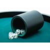 Dobbelbeker Pro. Zwart Kunstleder. Recht model, professioneel en solide. Binnenzijde bekleed met groen velours. Hoogte 10 cm. Diameter 8 cm. Met 5 parelmoer dobbelstenen, 16 mm.