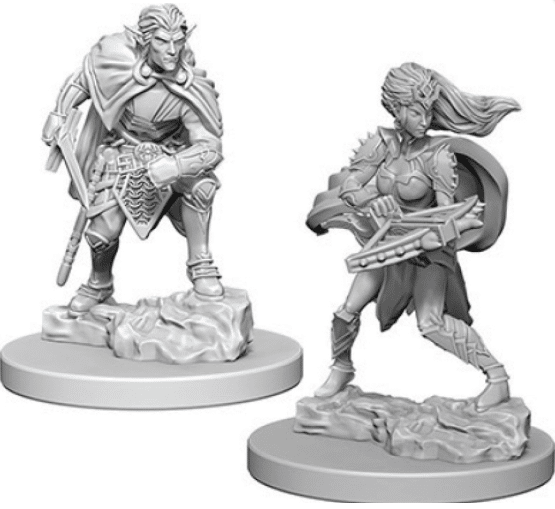 Twee ongeschilderde miniaturen van Drow om te gebruiken bij je favoriete rollenspel.