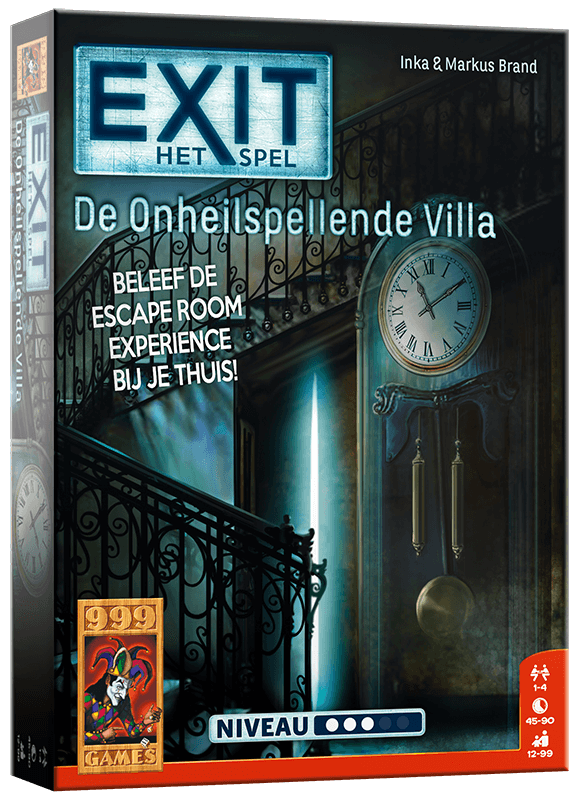 Ontsnap uit een onheilspellende villa. Probeer binnen anderhalf uur alle puzzels op te lossen en alle codes te breken. Alleen dan lukt het jullie om uit de angstaanjagende villa te ontsnappen. Logisch nadenken en doorzettingsvermogen zijn vereist om dit spel tot een goed einde te brengen. En komen jullie er echt niet uit, dan bevat het spel tipkaarten om jullie op het goede spoor te brengen. EXIT: De onheilspellende villa is maar één keer speelbaar omdat het speelmateriaal moet worden beschreven, gevouwen of afgescheurd. Maar net als in een “echte” escape room garanderen we een zeer intense puzzel- en speelervaring! De puzzels zijn vrij pittig. Daardoor is het spel vooral geschikt voor fervente puzzelaars en escape room-liefhebbers.