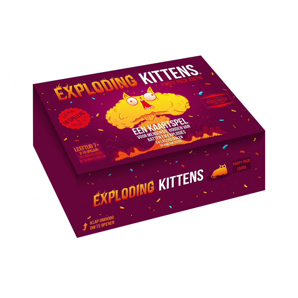 Het wordt feest met de Nederlandstalige Exploding Kittens Party Pack! Speel het hilarische kaartspel Exploding Kittens nu met maar liefst 120 vernieuwde kaarten, geschikt voor maximaal 10 spelers.