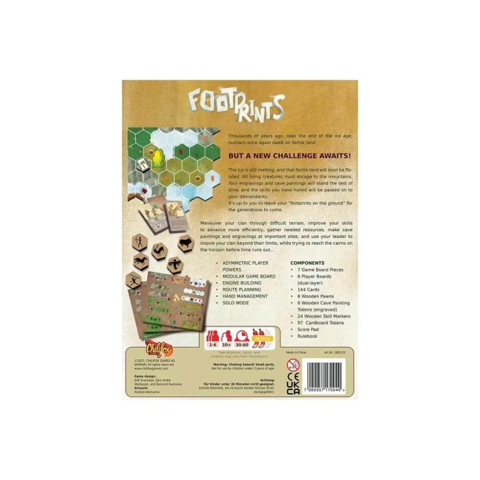 Footprints is een tactisch bordspel waarin je probeert zoveel mogelijk belangrijke dingen zoals grotschilderingen achter te laten terwijl je probeert te overleven in het nieuwe land!