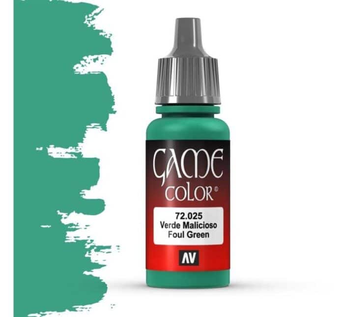 Vallejo Game Color Foul Green (72025) is een pigmentrijke acrylverf met een licht groenblauwe kleur in een handig 17ml. eyedropper flesje dat deel uitmaakt van de Vallejo Game Color serie.