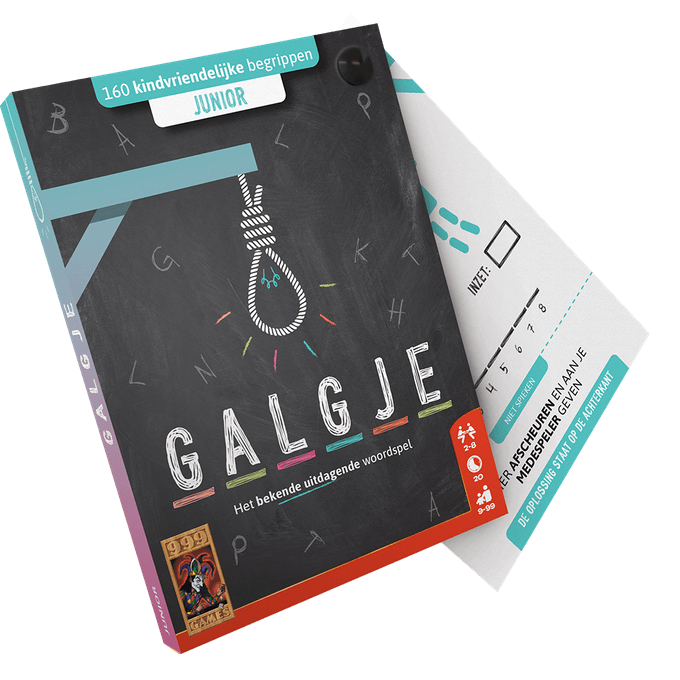 Galgje Junior is een compact en supersnel woordspel van 999 Games. Bedenk goed welke letters je kiest, want anders is de hangman ingekleurd. Dit is de juniorvariant van het welbekende Galgje, wat meer kindvriendelijk gemaakt is. Met dit spel kun je onmiddellijk beginnen met de zoektocht naar het verborgen woord. Belangrijk om te weten is dat je het geheime woord niet zelf hoeft te verzinnen. De 160 uitdagende begrippen staan al op het bijgeleverde blok met speelvellen. Dit maakt het spel direct toegankelijk.