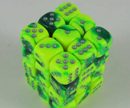 Gemini Green-Yellow/silver D6 12mm (36 stuks) CHX-26854 – Dobbelsteen set 36 x 12 mm dobbelstenen.