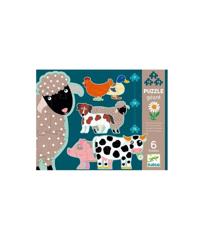 Honoré en zijn vrienden is een doos met 6 reusachtige, educatieve silhouetpuzzels van 9, 12 en 15 stukjes. Het kind zet de verschillende boerderijdieren in elkaar, een kip, een eend, een hond, een schaap, een varken en een koe. Nadat hij ze in elkaar gezet heeft, zet het kind ze op elkaar om een grote piramide van 1,40 m te maken. Deze puzzels zijn speciaal ontworpen voor kleine kinderen vanaf 3 jaar.