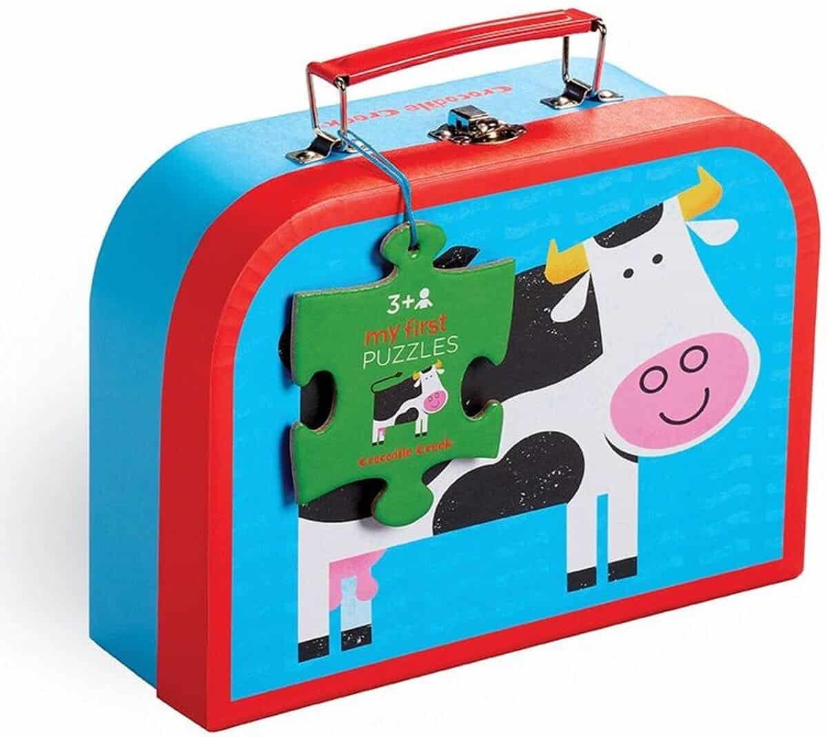 Een 3 in 1 puzzel met 6 stukjes, 9 stukjes en 12 stukjes in een leuk koffertje.