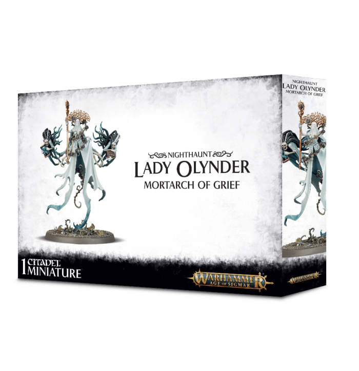 This multi-part plastic kit contains the components necessary to assemble Lady Olynder, Mortarch of Grief. As the Mortarch of Grief, she is surrounded by an aura of absolute misery. This miniature does an impressive job of capturing the bleakness. Hovering above the ground in her ghastly bridal dress and veil. Little can actually be seen of her form other than the outline of a skull. Her bridal train, ruined and shredded, flows out behind her. With a wisp of this ethereal garment attaching the miniature to its base.