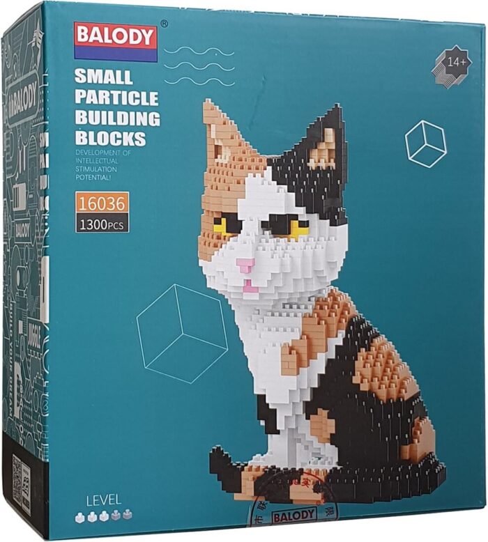 De Balody Lapjeskat is een erg leuke kunststof bouwset van Nanoblocks, speciaal voor volwassenen en kinderen van 12+. Deze eigenwijze lapjeskat zit met haar staart om haar lijf gekruld en heeft een nuffige uitstraling. De kleuren op haar kop zijn opvallend verdeeld: de ene helft is zwart en de andere bruin, terwijl haar witte gezicht prachtig contrasteert met haar schattige, roze neusje. Totaal 1300 stukjes.