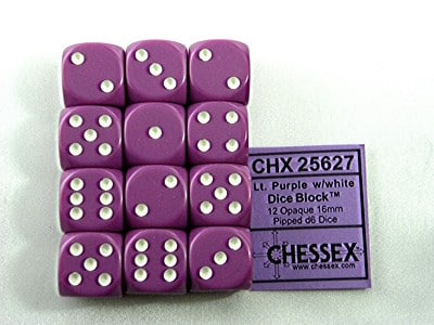 Brick met 12 x 16 mm dobbelstenen, effen gekleurd. Kleur: licht paars met witte stippen.