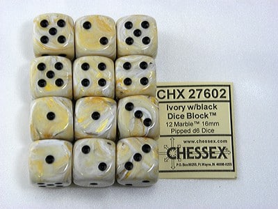 Marble Ivory w/Black D6 16mm. 12 zes-zijdige dobbelstenen voor verschillende spellen.