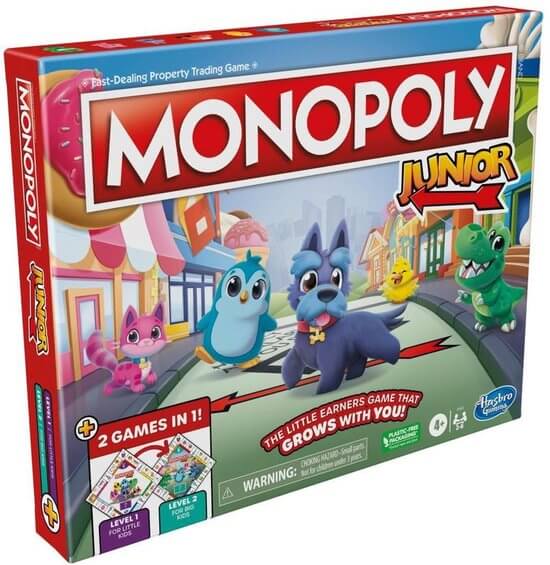 Met Monopoly Junior kunnen kinderen alvast kennis maken met Monopoly. Deze versie heeft 2 spelniveaus waardoor je kan meegroeien met het spel.