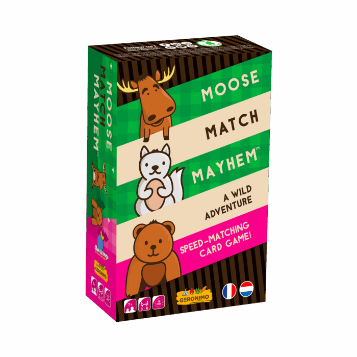 Moose Match Mayhem is een vrolijk en razendsnel kaartspel van Geronimo Games. Dit spel draait om het matchen van identieke elandenkaarten. Bovendien moet je ook nog de juiste elandengeluiden nabootsen. Daardoor zorgt dit voor hilarische momenten aan tafel. Dit spel is perfect voor gezinnen en vriendengroepen. Bovendien is het een ideale ‘filler’ voor een gezellige spellenavond. Door het eenvoudige concept kun je direct beginnen met spelen.