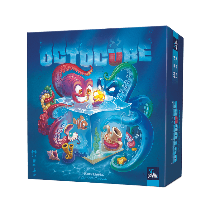 In the depths of the seas, octopuses compete for treasures left behind by surface dwellers; they collect and stack them in their secret lairs. In Octocube, you take the form of a cubic octopus, rolling from stack to stack of tiles to magnetically gather as many objects as possible. Choose them carefully while blocking your opponents.