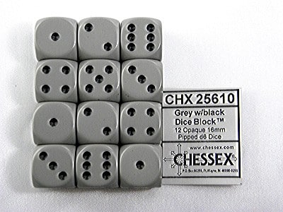 Brick met 12 x 16 mm dobbelstenen, effen gekleurd. Kleur: grijs met zwarte stippen.