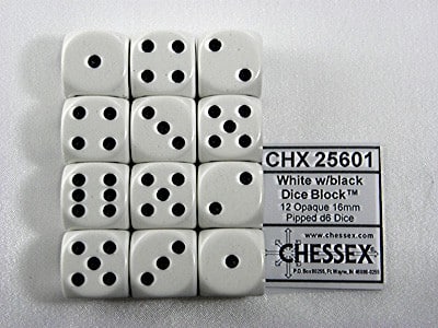 Brick met 12 x 16 mm dobbelstenen, effen gekleurd. Kleur: wit met zwarte stippen.
