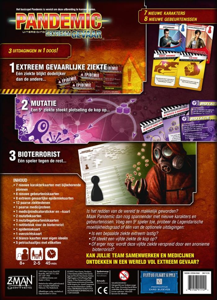 Was de pandemie in het basisspel eenvoudig tegen te gaan? Dan biedt deze expansieset uitkomst: breid het basisspel flink uit met diverse spelmaterialen en verhoog de spanning van het spel! Vooral de nieuwe rollen en gebeurteniskaarten zorgen voor meer variatie in de mogelijkheden van de spelers en je kunt het spel nu zelfs met 5 spelers spelen. Het is tevens mogelijk om één persoon in de rol van een bio-terrorist te laten kruipen en het de mensheid lastig te maken. De rest van de spelers zal dan deze speler moeten stoppen om de wereld te redden.