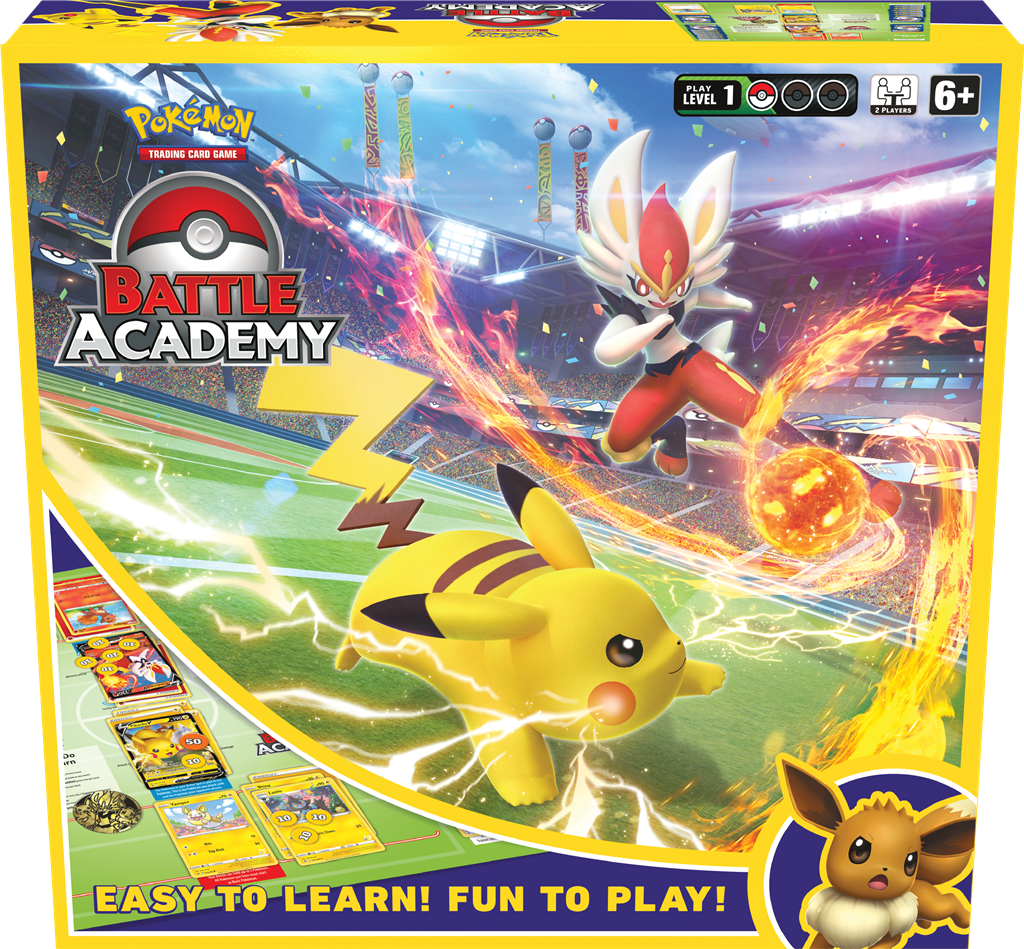 De Battle Academy bevat alles wat twee spelers nodig hebben om te spelen, met regelboekjes voor de decks, zodat je eerste game gemakkelijk te leren is. Je kunt Cinderace of Pikachu kiezen om je team te leiden in een heads-up-gevecht tegen een andere Trainer. Verwissel dan de decks om Eevee tegen Cinderace of Pikachu te spelen en leid een ander team Pokémon de arena in! Met een beetje strategie en een beetje geluk kun je de strijd aangaan met de besten!