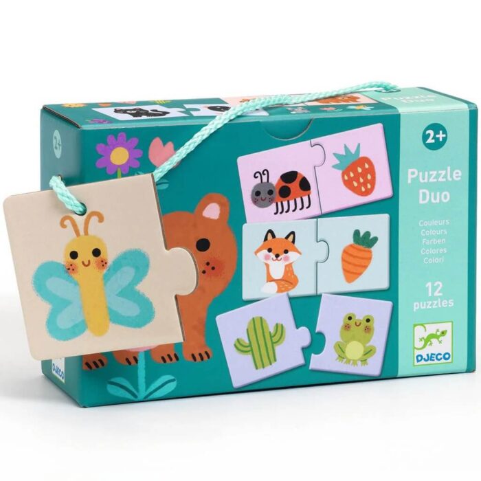 Leer kleuren herkennen met de twaalf vrolijke duo-puzzels van Puzzle Duo – Kleuren – 12 puzzels. Een educatieve en kwalitatieve set voor de allerkleinsten.