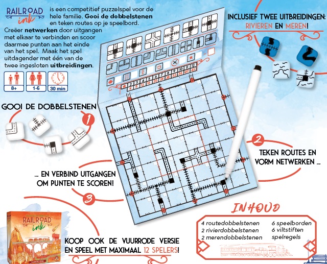 Railroad Ink is een competitief puzzelspel voor de hele familie. Gooi de dobbelstenen en teken routes op je speelbord. Creëer netwerken door uitgangen met elkaar te verbinden en scoor daarmee punten aan het einde van het spel. Maak het spel uitdagender met één van de twee ingesloten uitbreidingen.