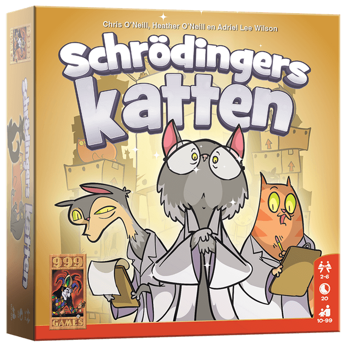 Een vraag die kwantumfysicus Erwin Schrödinger zich al in zijn beroemde experiment stelde, en nu ook aan jullie! In Schrödingers katten uiten jullie namelijk risicovolle stellingen met betrekking tot de inhoud, en vooral de hoeveelheid, van de dozen op jullie handkaarten. Daarbij overbieden jullie elkaar voortdurend. Wel een beetje jammer dat je alleen je eigen kaarten kent. Je moet dus handig inschatten, of bluffen. Maar drijf het niet te ver door! Want als aan je stelling wordt getwijfeld, draaien jullie alle kaarten om en wordt je bewering gecontroleerd. Je kunt maar beter gelijk hebben, anders lig je uit het spel! Wie van jullie lukt het om als laatste over te blijven?