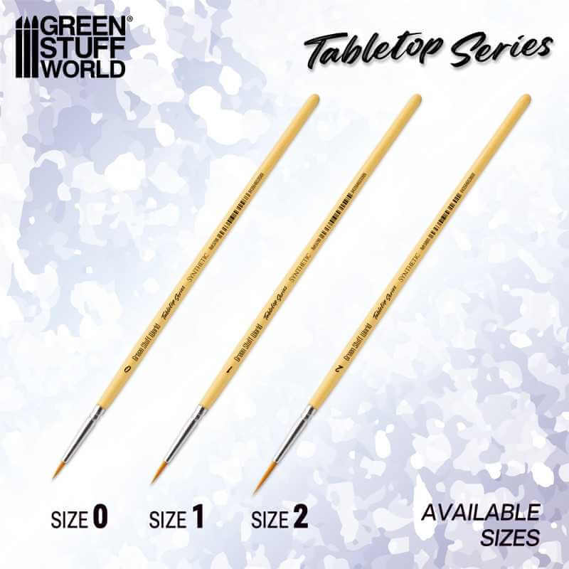 The synthetic brushes in the Green Stuff World Tabletop Range are ideal for both beginner painters and advanced modelers. Available in three essential sizes: No. 0, No. 1, and No. 2. They offer great versatility and adapt to different painting techniques.