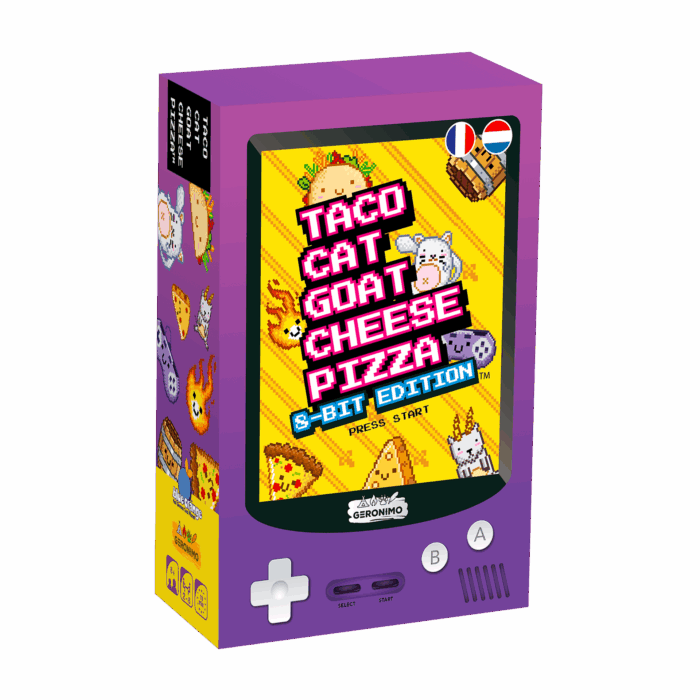 Taco Cat Goat Cheese Pizza: 8-Bit Edition brengt het razendsnelle en hilarische kaartspel naar een nostalgische nieuwe dimensie! Dit is het perfecte spel voor iedereen die houdt van snelle reacties en een flinke dosis chaos aan tafel. Het spel is uiterst gemakkelijk te leren; je hoeft alleen maar om de beurt een kaart op te leggen terwijl je een vaste reeks woorden herhaalt: “Taco, Cat, Goat, Cheese, Pizza.”