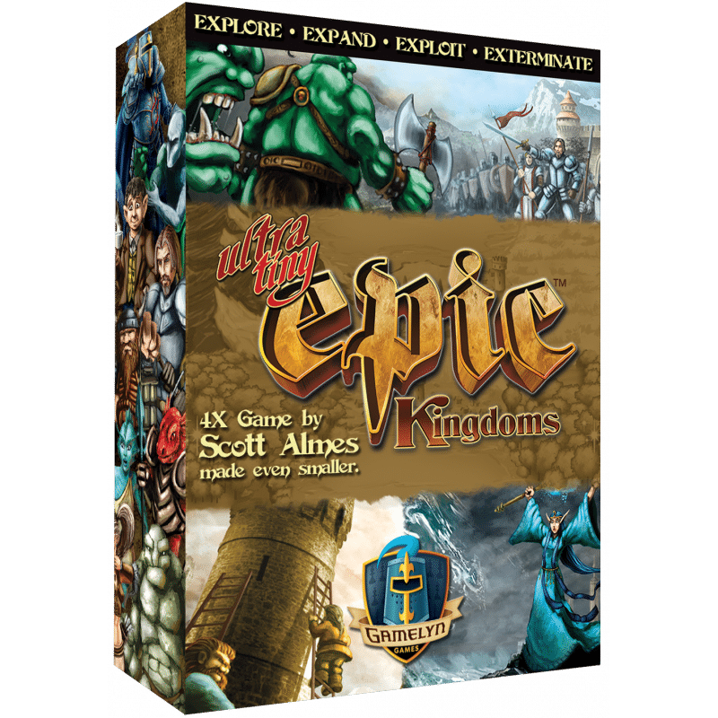 In Ultra Tiny Epic Kingdoms, a 4x fantasy game in a pocket-size package, each player starts with a unique faction with a unique ability and a small territory. In the game, players collect resources, explore other territories, battle each other, research magic, and work to build a great tower to protect their realm.