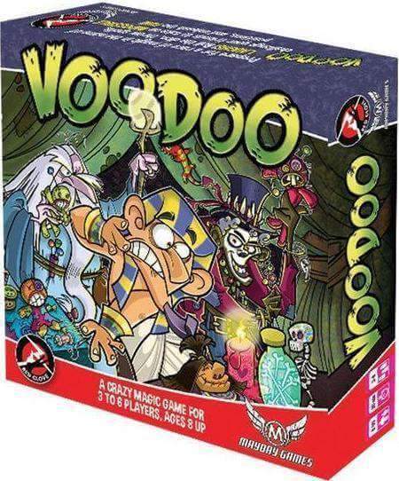 Kijk uit voor duistere magie en eeuwenoude vloeken in Voodoo! Rol de dobbelstenen om vloeken op je tegenstanders uit te spreken en de meester van Voodoo te worden. Gebruik de symbolen op de dobbelstenen als ingrediënten voor je magie, en maak het leven van je vijanden moeilijker met je spreuken – laat je buurman met zijn tong uit zijn mond praten, bijvoorbeeld, of dwing iemand om iedere beurt een rondje rond de tafel te laten rennen. Weet jij al deze vloeken het langste te overleven?