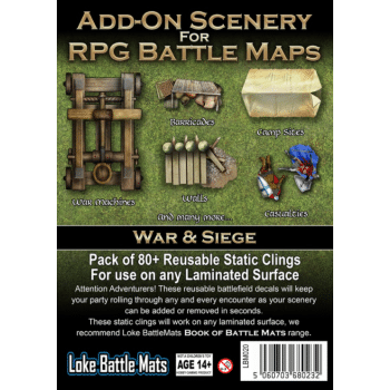 Add-On Scenery for RPG Maps – War & Siege is a pack of 80+ reusable static clings for use on any laminated map or surface. These reusable Siege Weaponry, encampments, weaponry and campsite features allow you to instantly add realism and a host of features to your battle maps. Relax and run your game in style with this handy pack that reduces work and adds fun to game night!