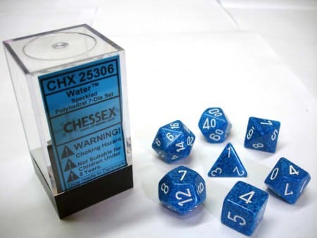 Set van 7 polydice, gevlekt. Kleur: blauw met witte cijfers.